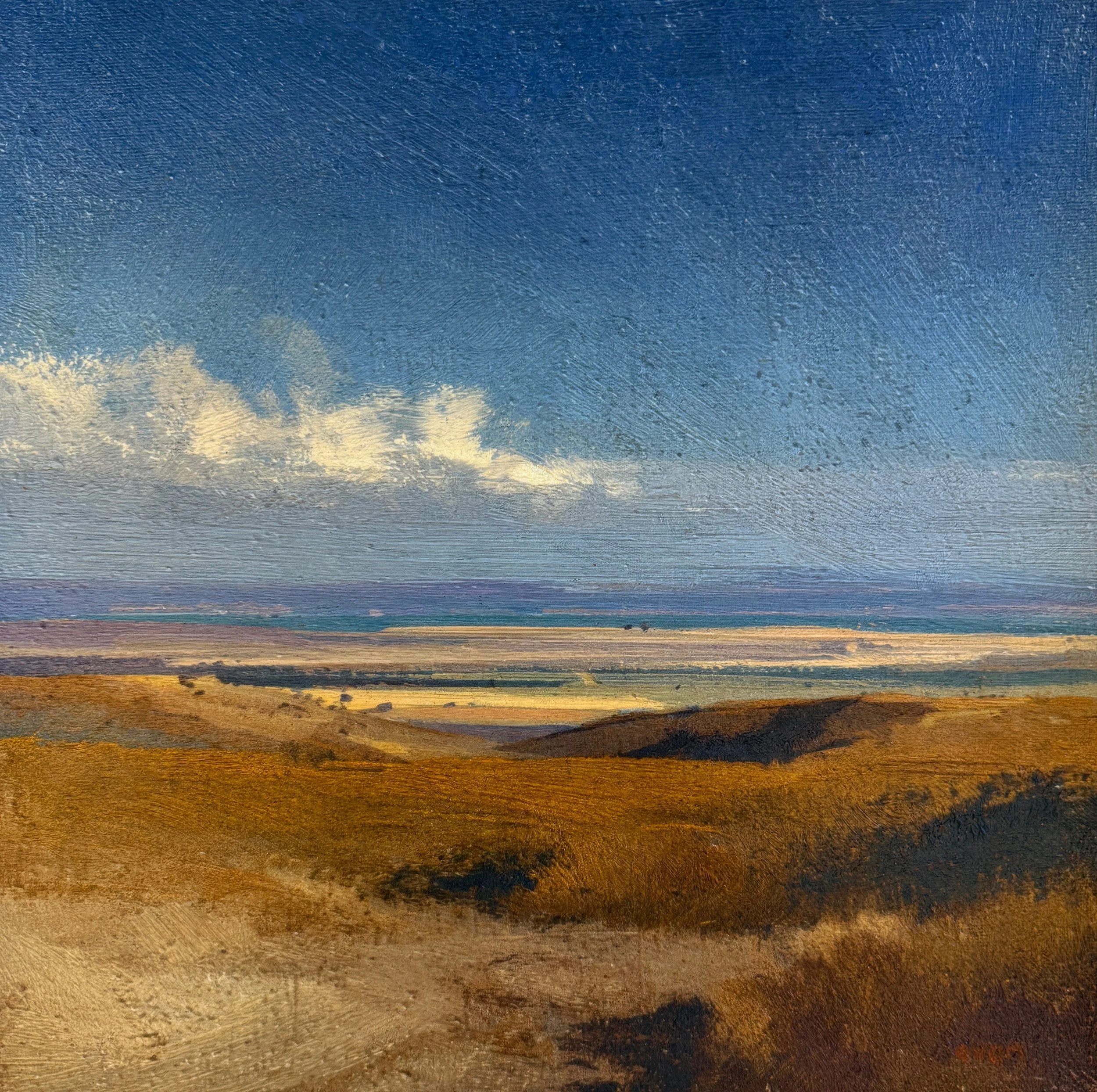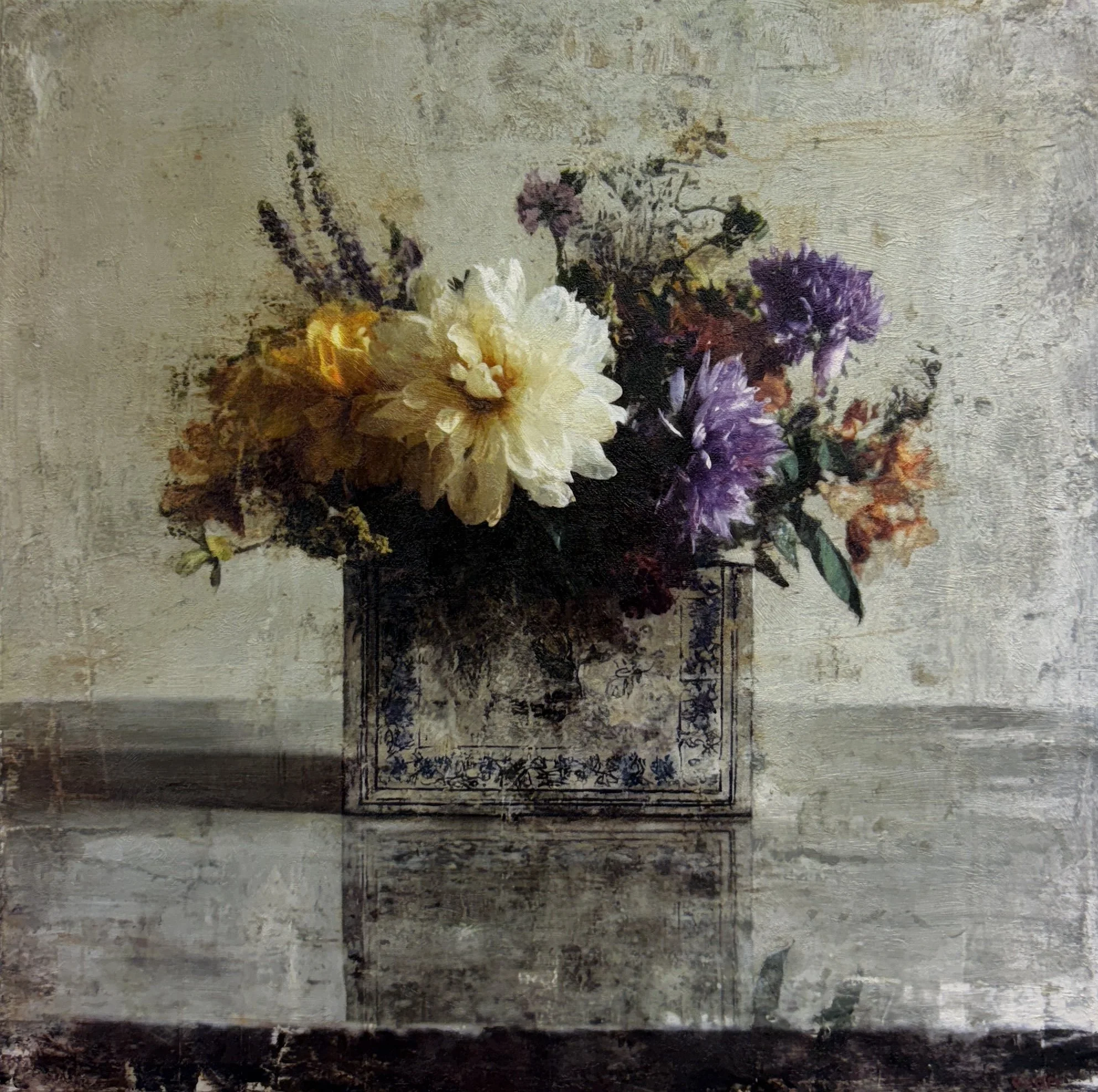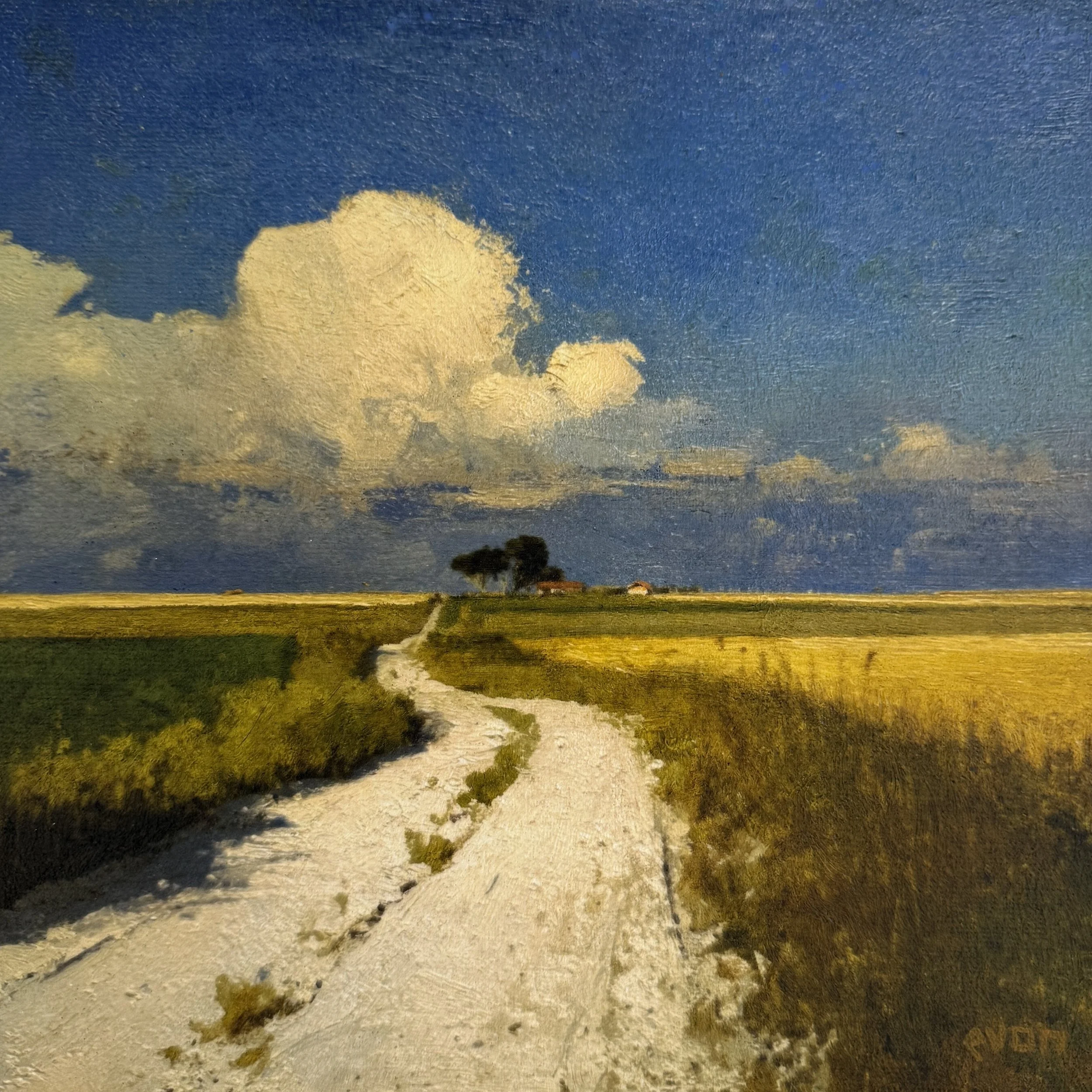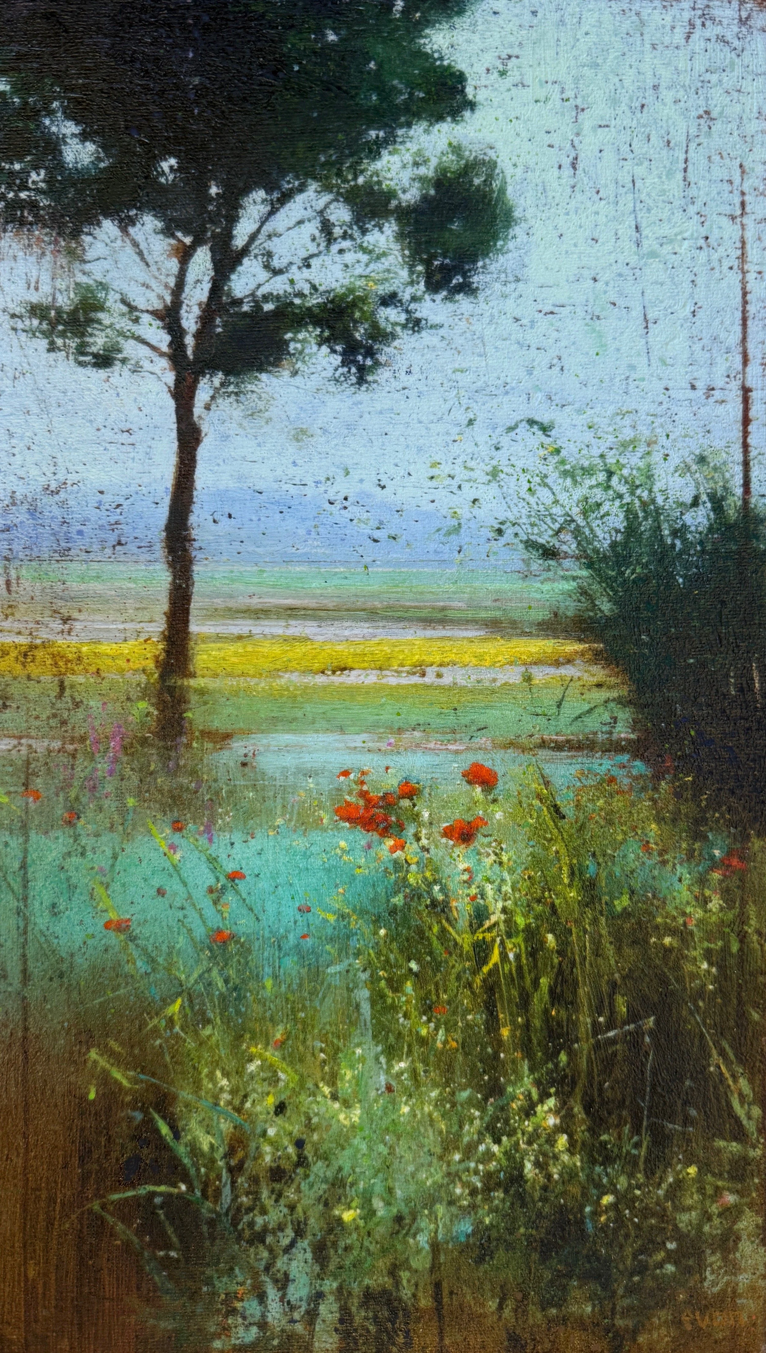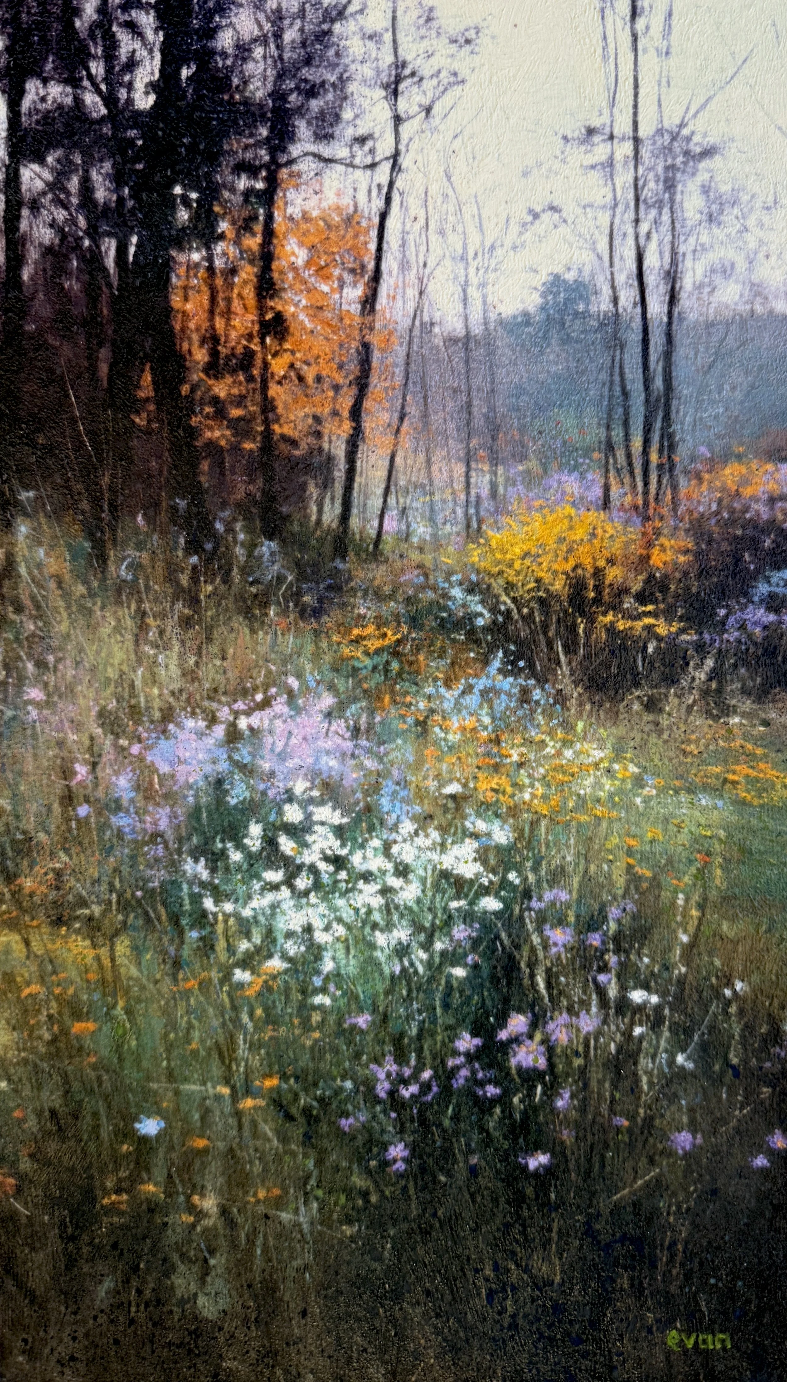 I begin with a ground of gesso and pumice, coarse and resistant, functioning both as a record of the initial impression, a compositional sketch, and a physical landscape — scarred, gritty, and alive. Over this surface, materials accumulate: transparent washes of acrylic drift like weather, pen and ink lines carve out clarity, and oil settles with weight and finality or scatters across the surface like wildflowers.